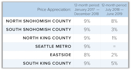 Over these last five years, we have seen double-digit year-over-year appreciation, specifically from 2015-2018. In fact, 2018 started out with 14% price gains over 2017. This was due to rapid job growth, tight inventory, and low interest rates. It was the perfect storm to rapidly drive up prices. In the second half of 2018, interest rates started to rise, inventory had huge gains, and affordability became an increasing issue. This stalled out demand and prices came off their spring peak. The second half of 2018 brought on a price correction and started to lead a path toward more normal appreciation levels.